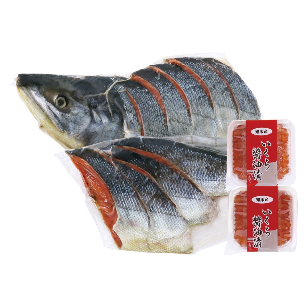 鮭の山漬け 半身(1kg・2分割真空パック)、いくら醤油漬け80g×2パック
