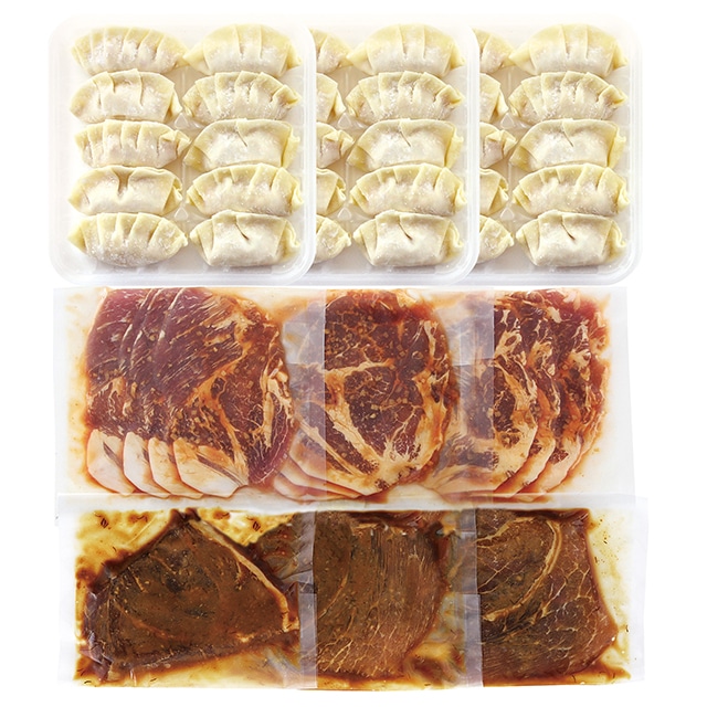 ジューシーな肉汁が詰まった餃子、しょうが焼き用のたれで味付けした肩ロース肉、コクのある甘味噌だれで漬けたもも肉。黒豚の美味しさを3種類の味わいでご賞味ください。