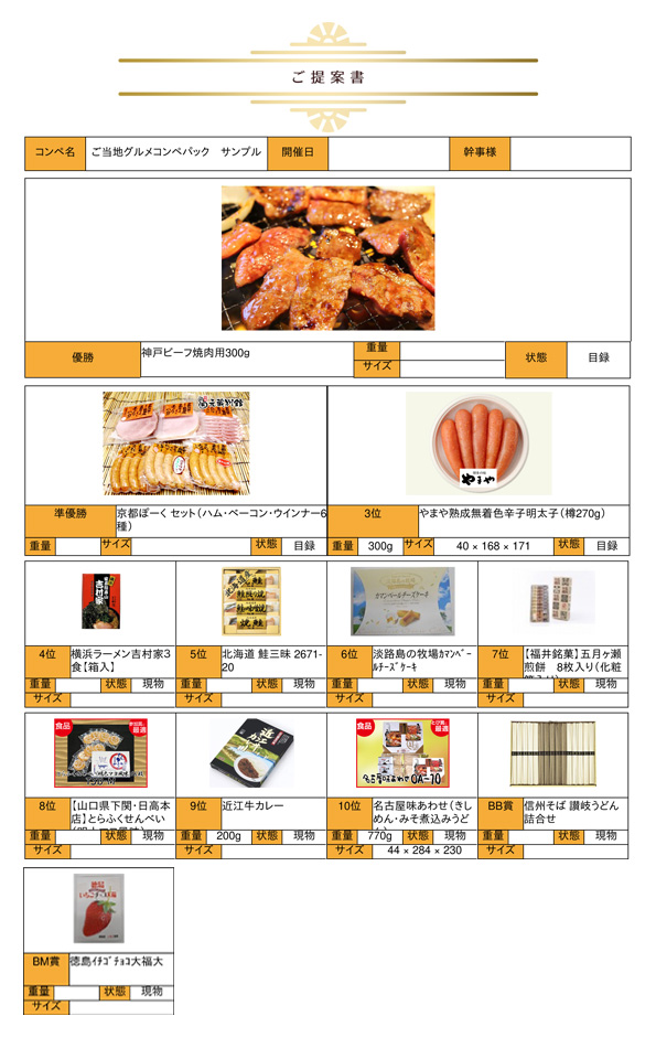 全国のグルメ賞品を一つにまとめたコンペパックです。優勝賞品の神戸ビーフをはじめ、あらゆるグルメが楽しめます。